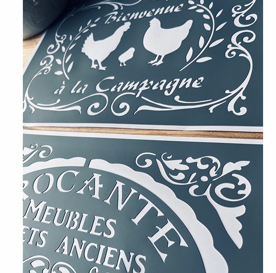 DIMENSIONS: Ensemble de 2 pochoirs adhésifs mesurant chacun 30 x 20 cm, parfaits pour créer des motifs thématiques de style campagne et ancien.