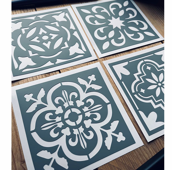 FABRICATION FRANÇAISE : Ensemble de 4 pochoirs artisanaux pour créer des motifs de carreaux de ciment et de faïence traditionnels.