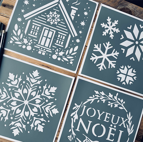 DIMENSIONS: Ensemble de 4 pochoirs adhésifs mesurant chacun 20 x 20 cm, parfaits pour créer des motifs thématiques sur le thème des fêtes de Noël.
