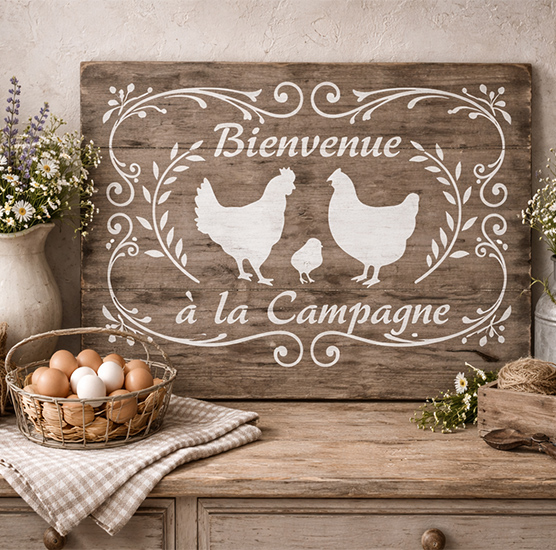 Pour un rendu encore plus authentique, appliquez le motif sur un support en bois brut, lin ou légèrement patiné, puis privilégiez des teintes naturelles comme le gris, le beige ou le taupe. Un léger effet vieilli obtenu par ponçage accentuera le style campagne et donnera du caractère à votre création.